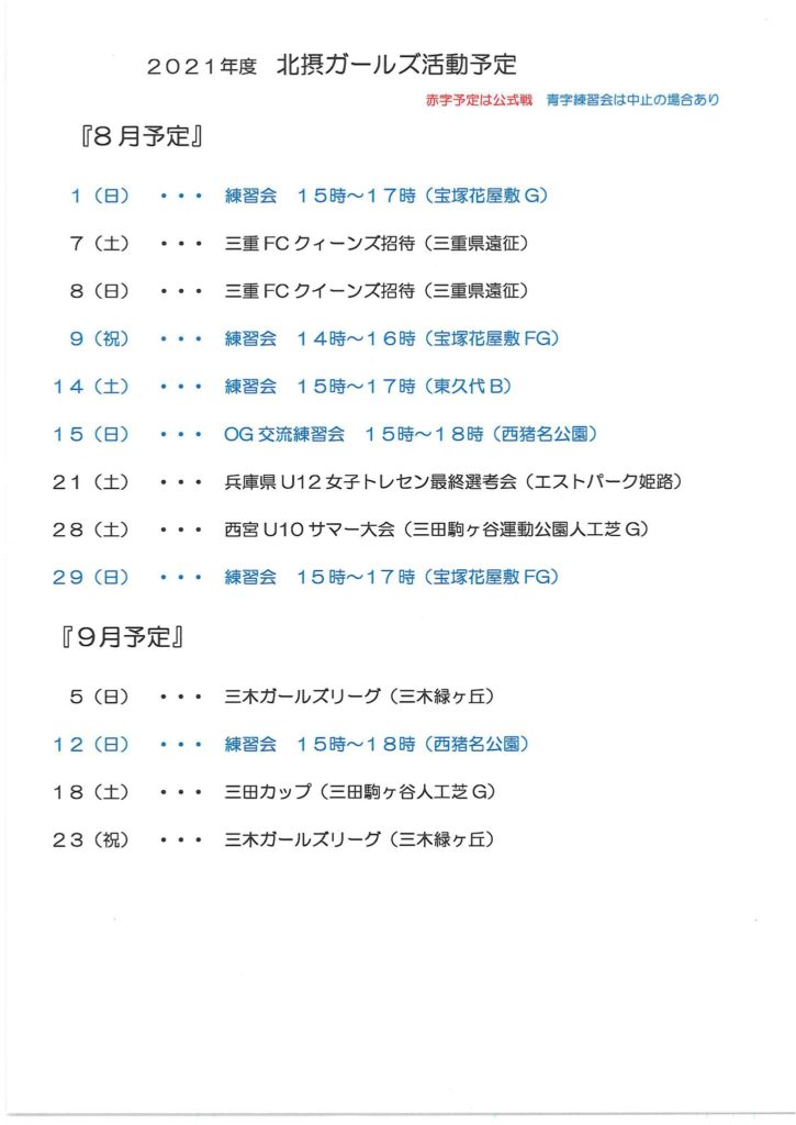 8月の活動予定です。暑い日が続きますが、体験生やOGのご参加お待ちしております!!