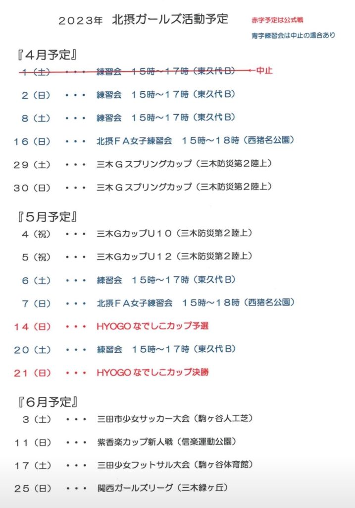 4月~6月 予定 2023年4月17日 最終更新日時 : 2023年4月17日 hokusetsu-girls 6月までの予定をUPします新入部員 大募集中です‼️少年チーム活動と並行しての参加もOKです!体験参加お待ちしております!!お申込み・お問合せは<見学・体験募集>・<問い合わせ>からお願いします🙇