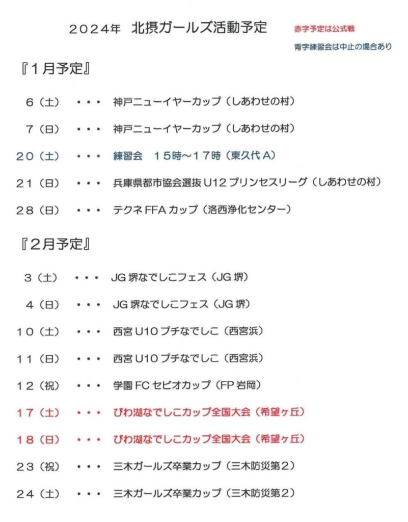 1月~ 予定 2023年12月23日 最終更新日時 : 2023年12月23日 hokusetsu-girls 北摂ガールズ、1月の予定です❗️体験参加のお申込み・お問合せは<見学・体験募集>・<問い合わせ>からお願いします🙇
